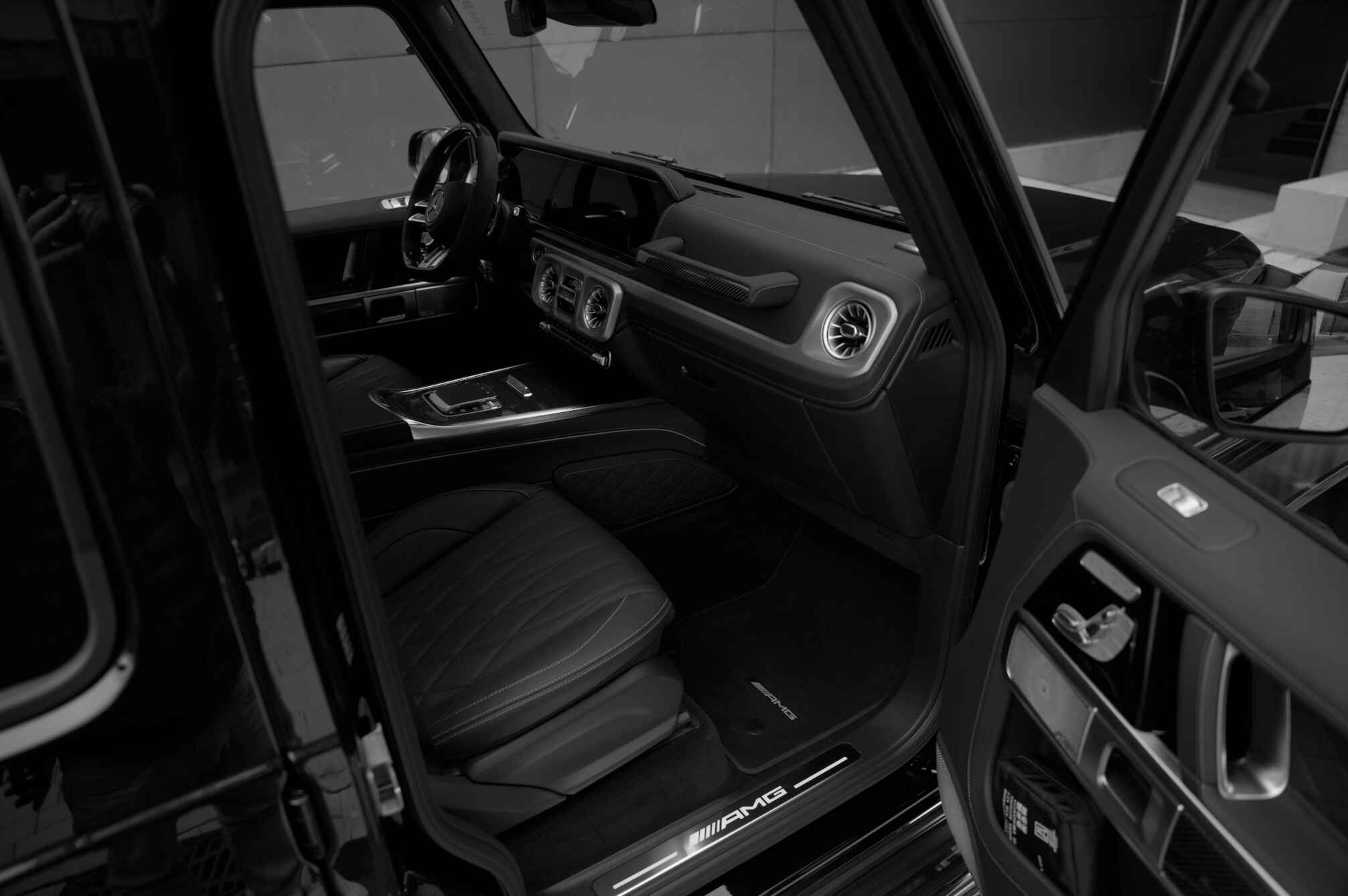 G 63 mieten und brandneues Interieur erleben. Durch das geräumige Interieur ist die brandneue Mercedes G Klasse zu mieten ein ultimatives Fahrvergnügen. Besonders auffällig sind Features wie der ikonische Haltegriff auf der Beifahrerseite als Wink an das Geländeerbe der G-Klasse. Weitere Highlights wie die beleuchteten AMG Einstiegsleisten und luxuriöse Ledersitze mit Diamantmuster sorgen beim G Klasse mieten für eine einladende Atmosphäre. Das AMG Performance Lenkrad in Carbon-Design mit in Mikrofaser MICROCUT umwickelten Griffbereich, AMG Buttons und Aluminium-Schaltwippen mit markanter 12-Uhr-Markierung verleiht dem G63 AMG mieten eine authentische Rennsport-Essenz. Das MBUX Multimediasystem der neuen Generation zeigt die ideale Verbindung aus sportlichem Design und innovativem Bedien- und Anzeigekonzept. Spezifische AMG Anzeigen visualisieren die dynamische Ausrichtung, während Sie beim G Klasse mieten auf dem volldigitalen Kombiinstrument zwischen AMG-spezifischen Anzeigestilen wechseln können. AMG Zierelemente in Carbon verleihen G Wagon mieten den Geist der Rennstrecke. Seien Sie gespannt auf ein Hör- und Akustikerlebnis. Wenn Sie die brandneue G Klasse AMG mieten, tauch Sie mit dem Burmester® 3D Surround-Soundsystem mit bis zu 31 Lautsprechern in eine immersive Klangdimension ein.